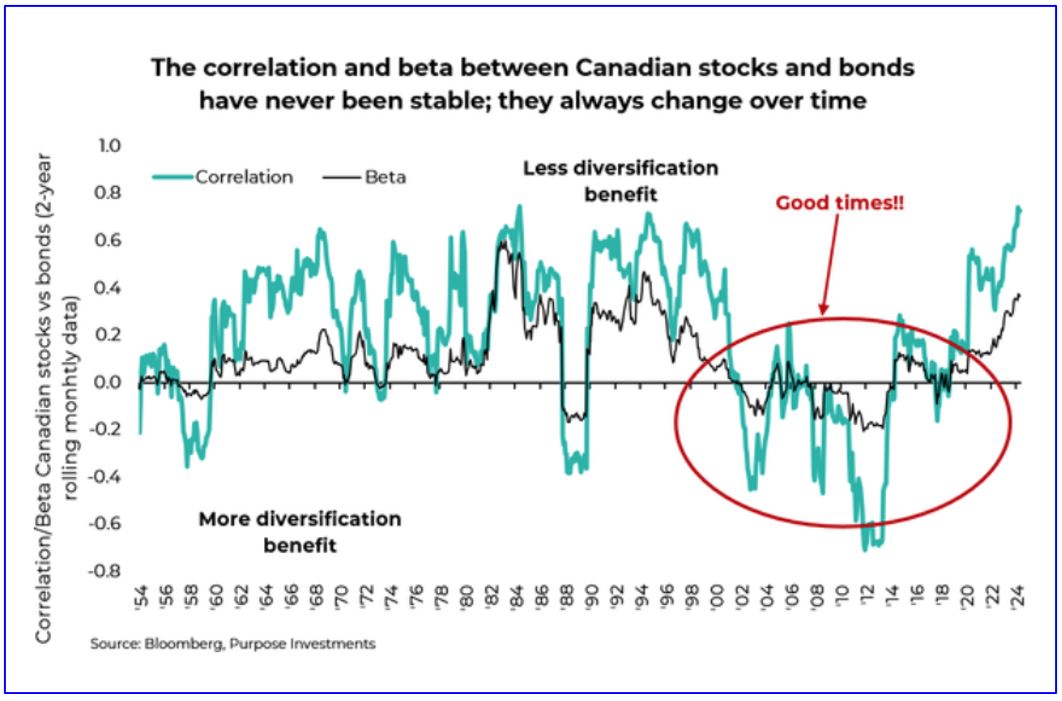 The following chart shows the two-year monthly correlation between Canadian equities and bonds. It looks rather similar for the U.S. and global markets, but we just thought some Canadian content would be nice. The higher correlation means that, more often, equities and bonds are moving in the same direction. Nobody complains when both are moving higher, like in the past 12 months, but when they move lower together, everyone starts getting grumpy, like in 2022. The second line, beta, measures not just the direction of the two asset classes but the magnitude of the relative move.
