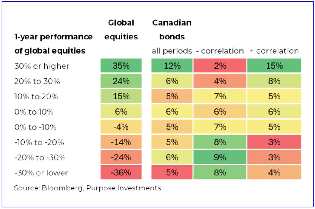 Here is a good lens. Using data back to the 1950s, we looked at the one-year returns for global equities and broke them down into return range buckets (see chart below). Truthfully, who cares what their bonds are doing when stocks are up 20% or 30%? But we do care much more when stocks are down -20% or -30%. More impactful – bond returns were further split from periods with negative bond/equity correlations and those with a positive correlation (last two columns).