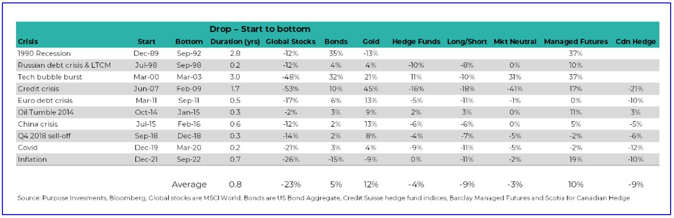 Another useful lens is “Crisis Alpha.” This is looking at an asset class or strategy’s performance during periods of stress in the market (see chart below). Could be a short-term correction or a longer-term bear market. If you can add value during these periods, or at least stability, that has positive attributes for portfolio construction.