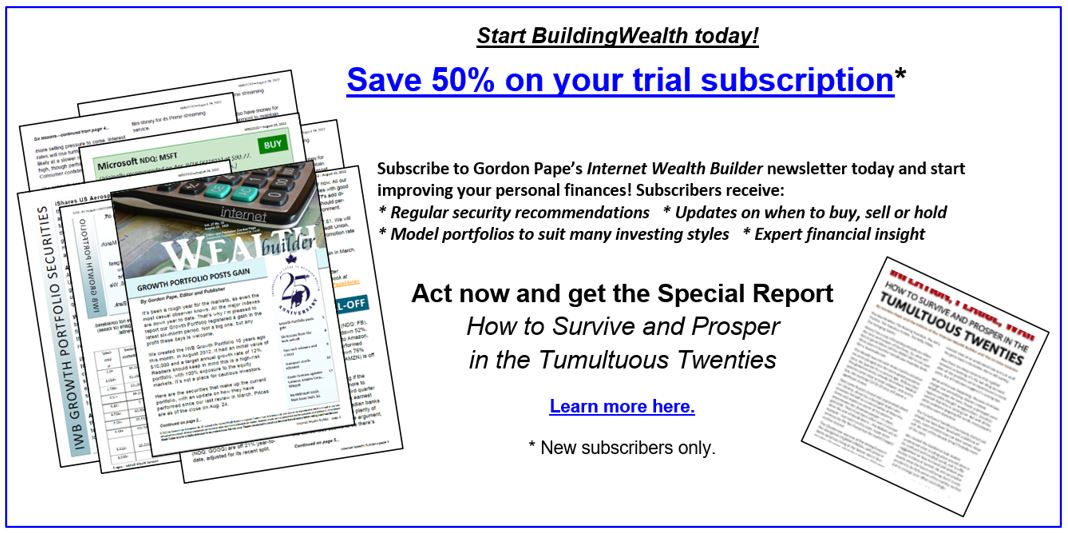 Gordon Pape is one of Canada’s best-known personal finance commentators and investment experts. He is the publisher of The Internet Wealth Builder and The Income Investor newsletters, which are available through the Building Wealth website. To take advantage of a 50% saving on a trial subscription and receive the special report “The Tumultuous Twenties,” go to https://bit.ly/bwGP20s.