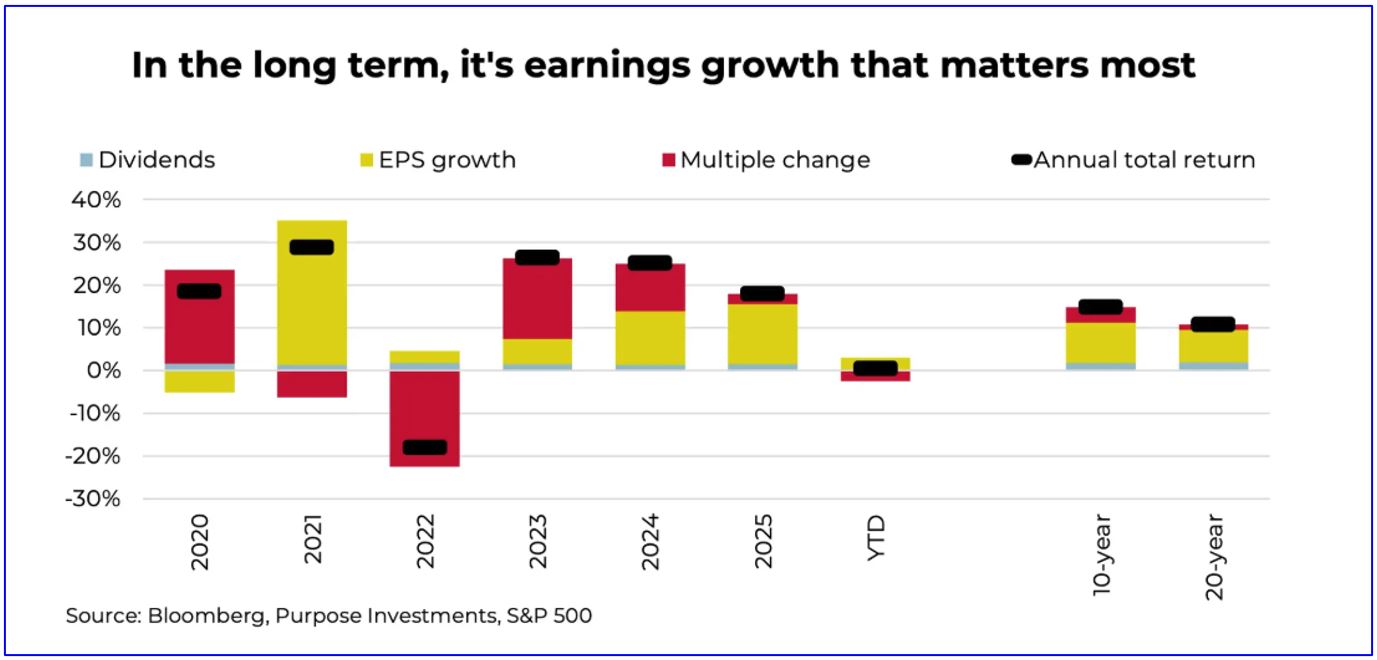 The easiest way to visualize this is by breaking down market returns into the underlying components. In the short term, multiple expansion or contraction is often the biggest driver, including over the past year. However, over the long term, it’s earnings growth that dominates as a driver of market returns.