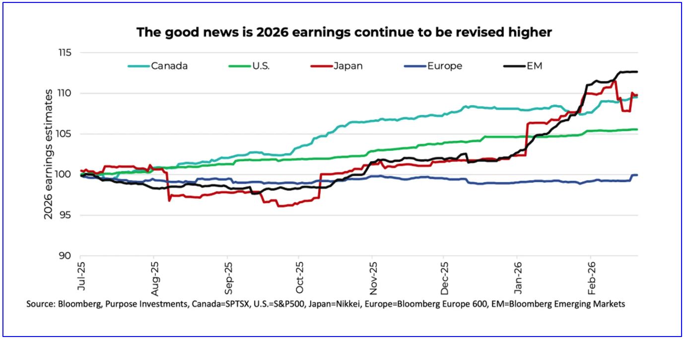 Estimates for 2026 calendar year earnings have risen by 12% for emerging markets (EM) since last summer. The TSX and Japan have also enjoyed strongly positive earnings revisions. And guess what are the best performing markets so far in 2026? Yep, Japan is at the top, followed by emerging markets and then the TSX. Europe and the U.S. are the laggards, still up but not nearly as much.