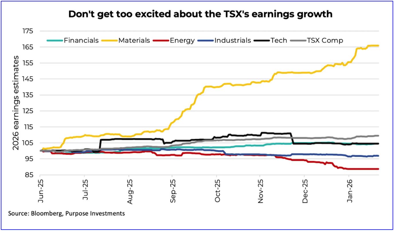 So is the place to be in 2026 Japan, emerging markets, and the TSX? We believe it could be with the first two, but we’re a little less enthusiastic about the TSX, the reason being where that earnings growth is coming from. The chart below includes the overall TSX’s 2026 earnings revisions, and as you can see, it’s all coming from Materials, led by gold. No question, gold companies are printing a lot of cash flow. But the market may not pay up much for such volatile earnings.
