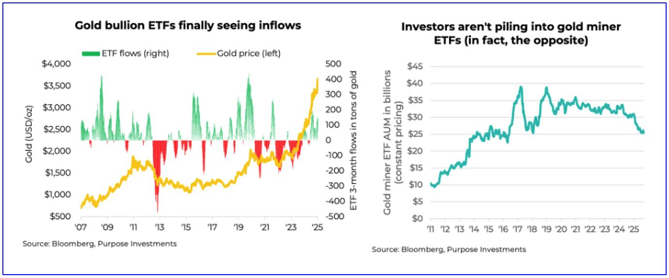 One could be flows. Fund flows into gold bullion ETFs have only recently turned positive, and the magnitude is not huge by historical standards, meaning it could expand to levels seen during past gold runs. And gold miner ETFs (XGD, GDX, RING) have actually seen outflows. Perhaps part of this muted response from a fund flow perspective is because of crypto, with many traditional gold bugs having switched over. If these flows accelerate to the upside, enticing investors with past performance, that is a reason to be bullish.