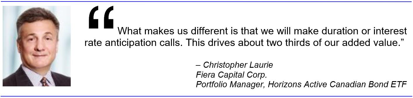 “What makes us different is that we will make duration or interest rate anticipation calls,” says Laurie. “This drives about two thirds of our added value. For example, the [benchmark] duration is now 7.5 years, but we can go as high as 10.5 or as low as 4.5, although there are limits on the maximum weightings of federal, provincial and corporate debt – what I call ‘sectors.’