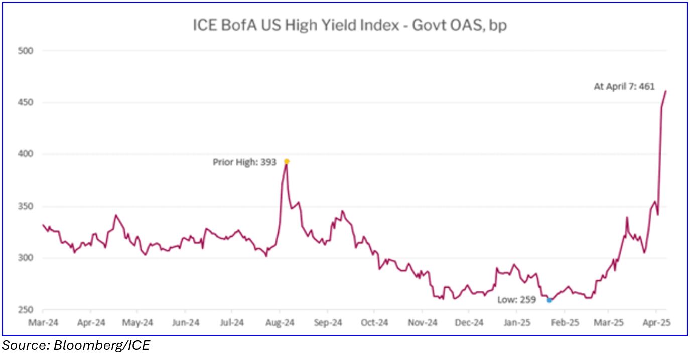 Compared with market episodes in recent memory, like December 2018 and March 2020, we expect that it will be more difficult for the Federal Reserve to support the market given elevated inflation and the prospect of tariffs increasing inflation further. We expect volatility will likely be heightened for some time and for trading opportunities to increase as individual securities become more dislocated relative to peers and fundamentals.