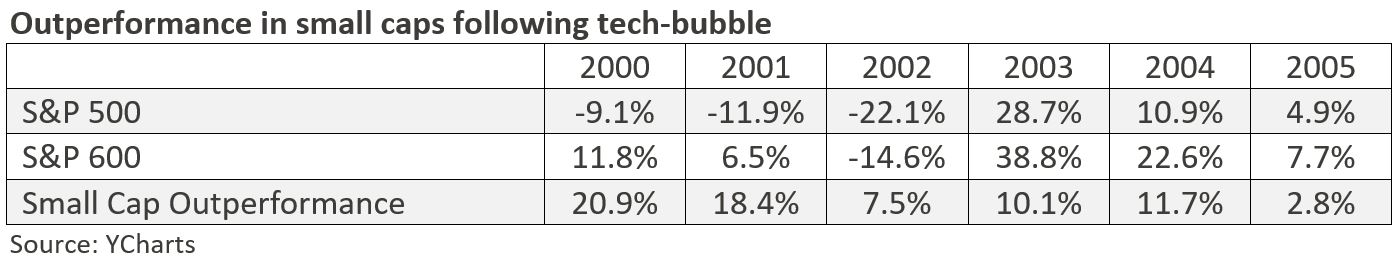 In the aftermath of the dot-com bust, small caps went on a multi-year run of outperformance. In the six years from 2000 to 2005, small caps outperformed in each year at an average rate of nearly 12% per year.