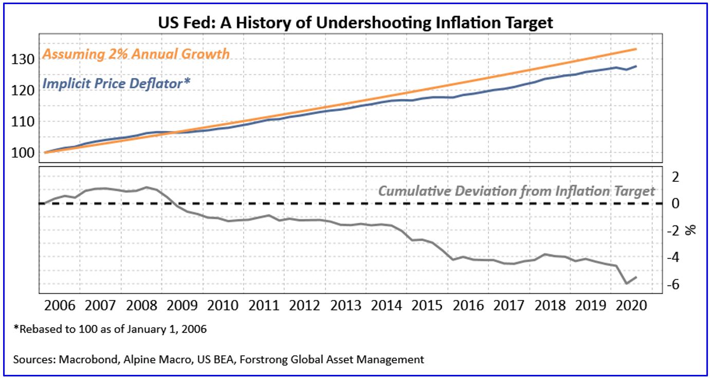 On the monetary side, global central banks are nearly unanimously assuming that recent inflation will be transitory, an aberration rather than the start of a secular shift. But this is a classic case of generals preparing to fight the last war. In the post-2008 period, central banks consistently overestimated growth and inflation. Now, conditioned by years of inflationary false alarms, they are assuming a long, plodding recovery with the same disinflationary dynamics. The Fed has even made major modifications to its monetary policy framework, completely jettisoning the Philips curve and shifting to an “average inflation targeting” approach. Based on past undershoots of inflation (roughly 500 basis points in the last 10 years for those counting), inflation can run substantively high without breaching the average inflation target.