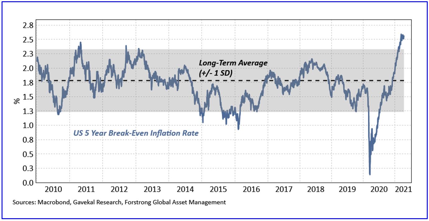 Over the coming three to five years, our investment team expects inflation to average modestly higher than the last two decades. Yet even with this moderate shift, investment leadership will radically change. Losing investments will be those that have been bid up on the “lower forever” inflation thesis. This includes the long-duration growth tech stocks that have become today’s darlings. Winners include bank stocks (which have become well-capitalized and are natural beneficiaries of a steepening yield curve) and industrials (and other sectors that can pass through rising costs). Other cyclical industries will come back in vogue. Emerging market bonds will catch a steady bid as there are few yield plays that offer positive real rates. Higher growth and higher inflation hold the key to these secular shifts. Markets are nowhere close to pricing any of this in.
