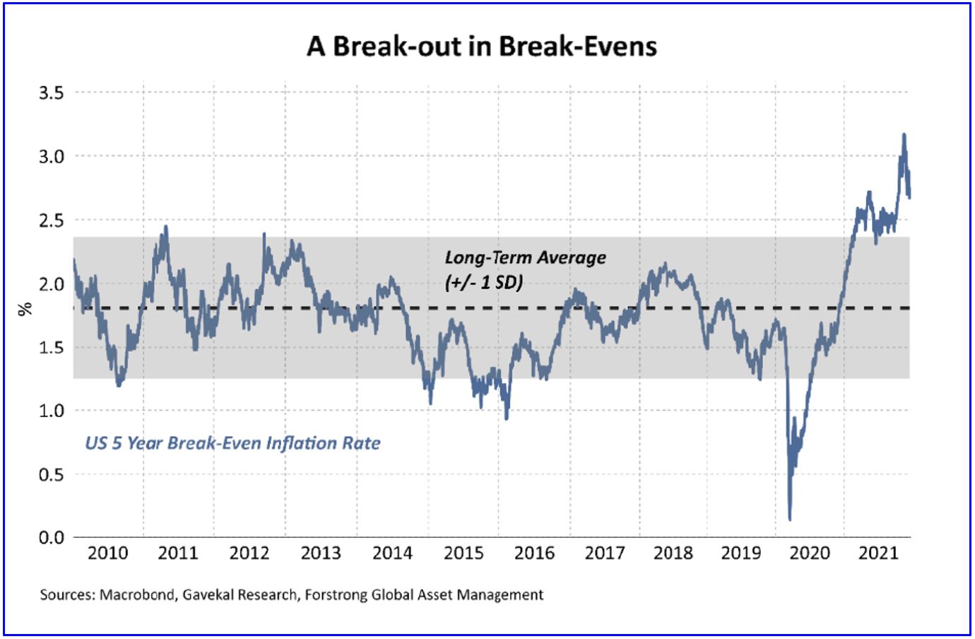 This can be viewed through a consumer, corporate, and government lens. Household balance sheets in the major economies are in very decent shape, capital spending is booming, and governments have abandoned austerity. There is also a behavioral component: inflation expectations. The U.S. five-year breakeven inflation rate (a market-derived proxy for inflation expectations) has gone from an all-out collapse in March 2020 to breaking out of its historical range and hitting the highest level in nearly 13 years.