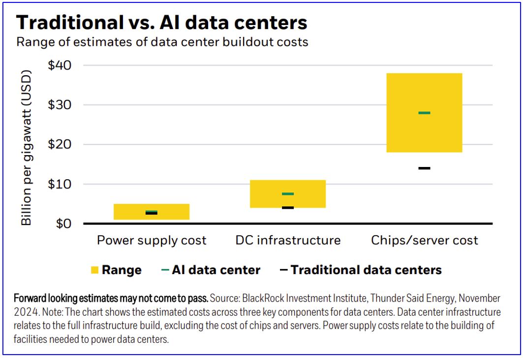 Advanced chips are one reason AI data centers – the backbone of the buildout – are costlier than traditional ones (see the chart below). Spending on traditional and AI data centers combined could top US$700 billion annually by 2030, industry estimates show. All this spending could add to inflation, including via higher near-term energy costs given AI’s huge power needs. Eventually, AI could boost energy efficiency, offsetting some of the initial spike in energy demand. Yet those savings can come only after mass AI adoption, a process that will take time.
