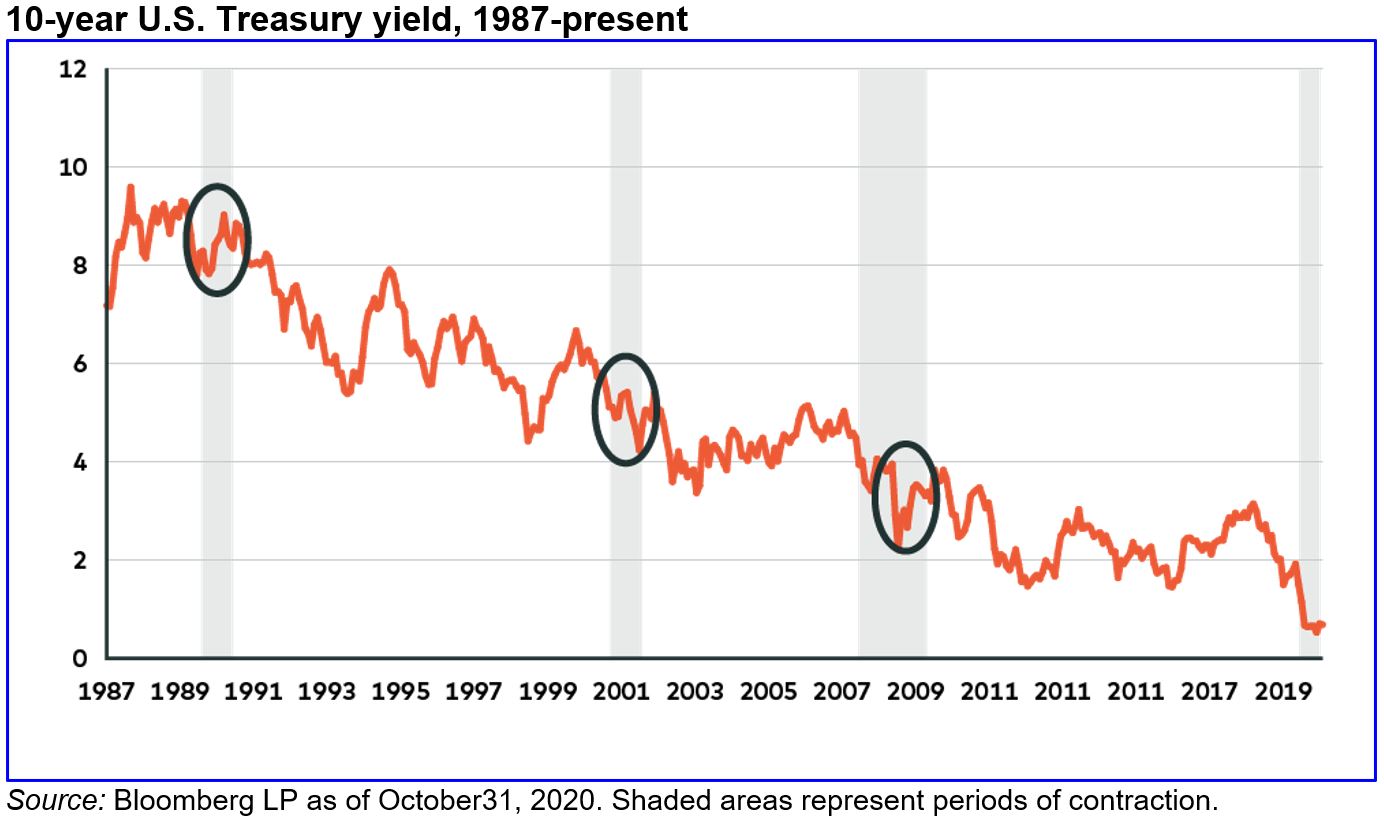 Why? Our rationale boils down to three factors. First, we view the economic cycle as having entered early recovery mode, which is historically a bearish time for bonds. Second, and correspondingly, inflation expectations have been rising cyclically, which should put upward pressure on yields. And finally, our base case is that the pandemic will begin to subside at some point in 2021, as an effective Covid-19 vaccine will be developed and deployed, or (at potentially much greater human cost) herd immunity will be reached.