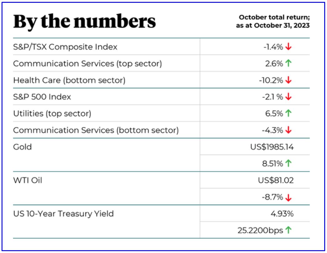 The sector that first saw the impact of the higher rates was the banks. While the U.S. regional bank crisis that took down SVB and several others earlier in the year seemed to be quickly forgotten, we are now hearing the larger banks in both Canada and the U.S. speak of a slowdown in their businesses and loan growth. As many market watchers say, “you can’t have a bull market without the banks,” and with many banks off over 20% on the year, without them turning around, it’s tough to be very optimistic about markets.