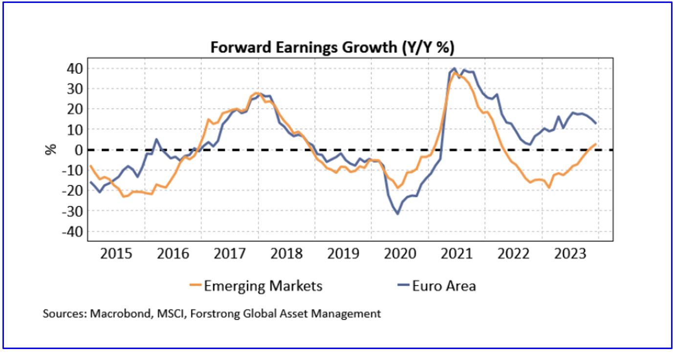 Next, turn to businesses. Global corporate earnings growth is still positive. And, now, key measures of world trade and manufacturing are improving. And while the U.S. has led earnings momentum over the last year, participation has broadened out: Euro area forward earnings are now in a strong uptrend and emerging markets forward earnings have hooked up sharply.