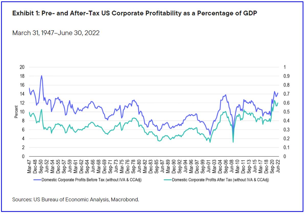 According to the most recent figures (second quarter 2022), U.S. after-tax corporate profitability reached its highest share of gross domestic product (GDP) in nearly 70 years. Pre-tax profits as a share of GDP were also near their postwar record highs. It is also interesting to note that corporate profits after tax have grown more than pre-tax income as corporate tax rates have fallen.