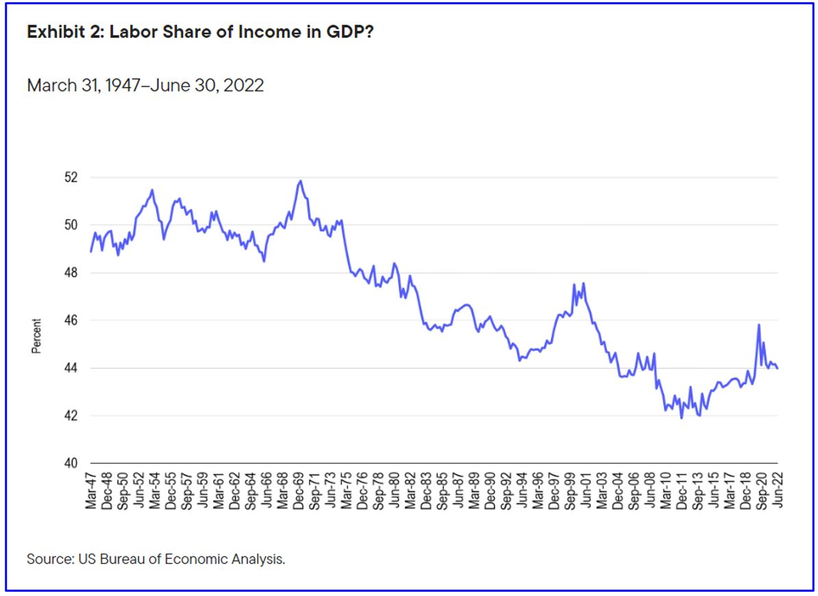 On the other hand, globalization of labor markets may have peaked following big shocks to globalization via tariffs, trade wars, the pandemic and rising geopolitical risk. Deglobalization could help restore worker’s bargaining power. However, bargaining power will remain constrained by the ever-rapid pace of innovation and the threat to jobs posed by automation.