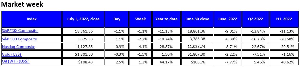 Growing fears of recession triggered by aggressive central bank monetary tightening, including rapidly rising interest rates, continued to weigh on stock markets, which ended last week with losses on the week, month, quarter, and first half. U.S. stock markets are firmly in bear market territory, while the Canadian stock market languishes in correction.