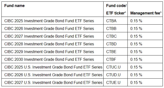 CIBC Asset Management Inc. on July 16 launched ETF series of the CIBC Investment Grade Bond Funds as shown in the table below. The funds trade on the CBOE CAN Exchange.