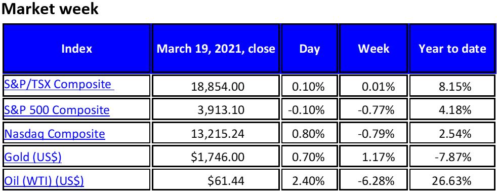 The major North American stock indexes closed Friday near breakeven for the week, with the U.S. indexes just slightly below and the Canadian benchmark flat. Investors digested first the U.S. Federal Reserve Board’s dovish rate announcement on Wednesday, keeping the fed funds rate between 0% and 0.25%. Treasury bond yields edged up again after the announcement, with the 10-year U.S. Treasury note climbing to 1.73% by Friday’s close as markets continued to anticipate strong growth, growing inflation, and higher policy rates. On Thursday, the Fed announced that it was rescinding a temporary exemption to the rule that U.S. bank must include Treasurys in calculation of their Supplementary Leverage Ratio. The order put bank stocks under pressure, weighing on both the S&P 500 Composite Index and the Nasdaq Composite Index, both of which edged down 0.8% on the week.