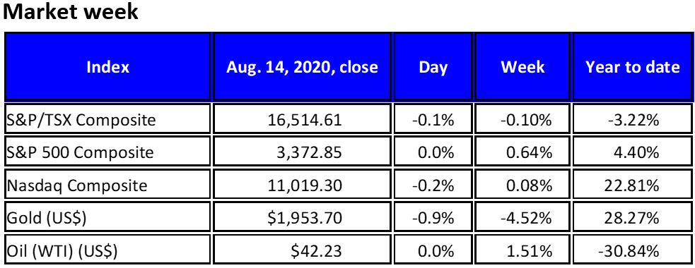 The major North American stock indexes put in an uninspiring week, neither gaining nor losing much ground, as the summer doldrums kicked in full time. The biggest contributor to negative sentiment in the U.S. markets was the continuing congressional deadlock over Covid-19 relief funding. While Congress remained stalled on extending the $600 per week unemployment support measure that expired on July 31, President Donald Trump last week signed an executive order that would partially fill the gap if various legal obstacles to such a move were overcome.