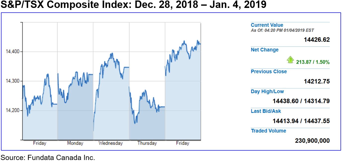 Toronto’s S&P/TSX Composite Index rose 1.4% on the week helped along by 9,300 new jobs created in December, a steady 5.6% unemployment rate, and a 6.3% advance in the price of crude oil on the week, which breathed some life into the energy sector.