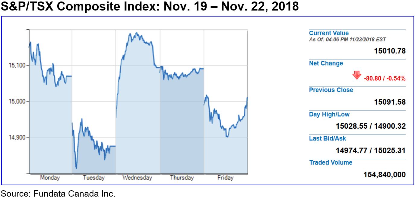 Spurred by concerns over oversupply, commodity traders sold crude oil in a big way this past week, as the price of WTI crude fell 11.2% on the week. That in turn contributed to selling pressure on North American stock markets, as market volatility was heightened by thinner trading volumes while traders took advantage of the market shutdown on the U.S. Thanksgiving holiday and half day on Friday. The S&P 500 Composite Index lost 3.8% on the week, and is now in correction, defined as at least a 10% drop from its recent high of 2,940. Similarly, the Nasdaq Composite Index continues in correction, losing 4.3% on the week, as the large-cap technology issues continued to slide. Toronto’s S&P/TSX Composite Index posted a 1.0% loss on the week, also bowing to selling pressure in the energy sector.
