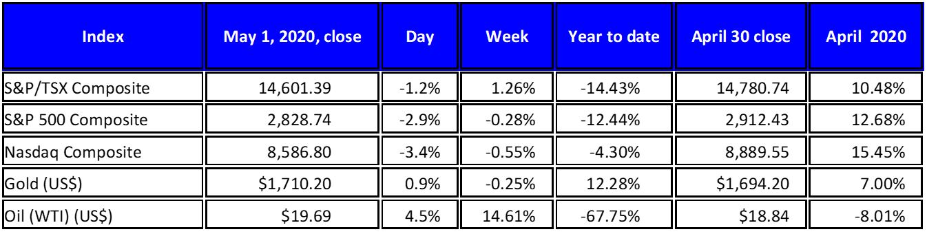 For the most part, the big North American market indices ended the week just a hair below breakeven, after a losing session on Friday that saw markets give up gains made earlier in the week. A strong showing in April with double-digit gains across the board had investors taking some profits off the table on Friday. Investor sentiment was dampened as Amazon.com Inc. reported declining profitability and warned of further weakness, the U.S. manufacturing sector showed weakness with the ISM Manufacturing Index at 41.5 for April (a reading below 50 indicates contraction), and U.S. President Donald Trump threatened to impose fresh tariffs on China.