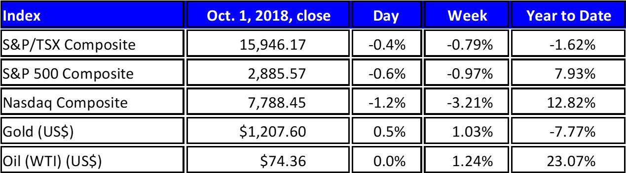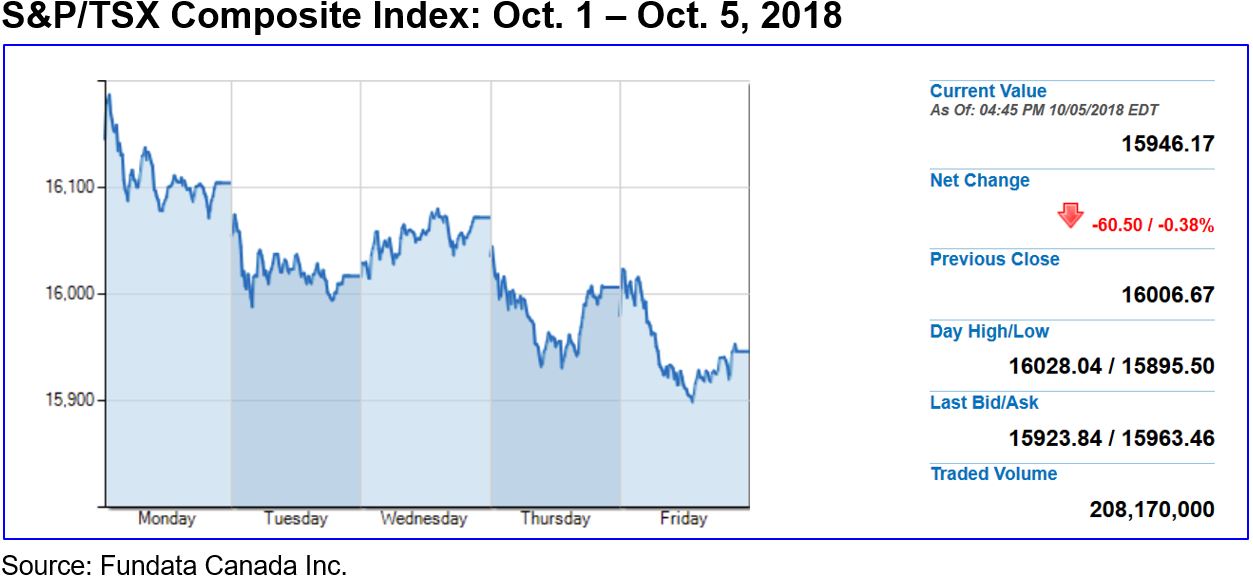 The yield on the 10-year U.S. Treasury note rose to 3.22% on Friday, continuing a bond selloff, as investors reacted to an ultra-low 3.7% unemployment rate and an annual 2.8% hourly wage gain, both indicators signaling continuing strength in the underlying U.S. economy, solidifying expectations of another rate hike by the U.S. Federal Reserve Board before year-end. Lower-than-expected job creation of 134,000 new payrolls in September was attributed to temporary labour market distortions in the wake of Hurricane Florence. North of the border, Statistics Canada’s monthly Labour Force Survey showed a gain of 63,000 jobs in September, continuing a recent volatile trend in monthly jobs data. Average hourly wage growth edged down to 2.2% in the month from 2.6% in August, while the unemployment rate ticked down to 5.9% from 6.0%. With investors selling equities in lockstep with U.S. markets, Toronto’s S&P/TSX Composite Index consequently posted a 0.8% decline on the week, despite a 1.2% gain in the price of WTI crude oil and a 1.0% uptick in the price of gold. The big blue-chip S&P 500 Composite Index retreated 1.0%. The Nasdaq Composite Index lost the most ground on the week, dropping 3.2%, driven mainly by losses in high-growth technology and Internet issues.