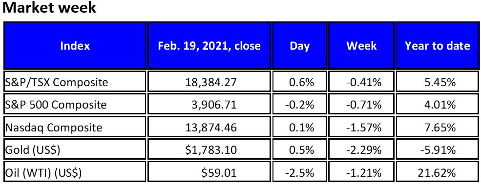 With concerns about rising U.S. Treasury note yields affecting riskier assets like equities down the road, stock markets lost some steam last week, closing below breakeven for the week. The yield on the benchmark U.S. 10-year Treasury note crept up to 1.34% on Friday, from 1.21% a week ago. Still, continuing optimism about the Biden Adminstration’s US$1.9 trillion pandemic relief bill making it through Congress by the end of February, growing Covid vaccination momentum, and dropping Covid case counts helped keep markets from sinking even further.