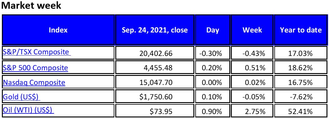 The market tizzy over Evergrande was dampened somewhat late in the week by the Fed’s growing hawkishness and willingness to commit to “soon” as a timeline for tapering. As a result, the S&P 500 Composite Index edged up 0.5% on the week, while the Nasdaq Composite Index recovered earlier losses to end the week flat. With pressure on materials and technology, the S&P/TSX Composite Index ticked down 0.4% on the week, avoid steeper losses as the energy sector strengthened on a 0.9% weekly gain in crude oil prices.