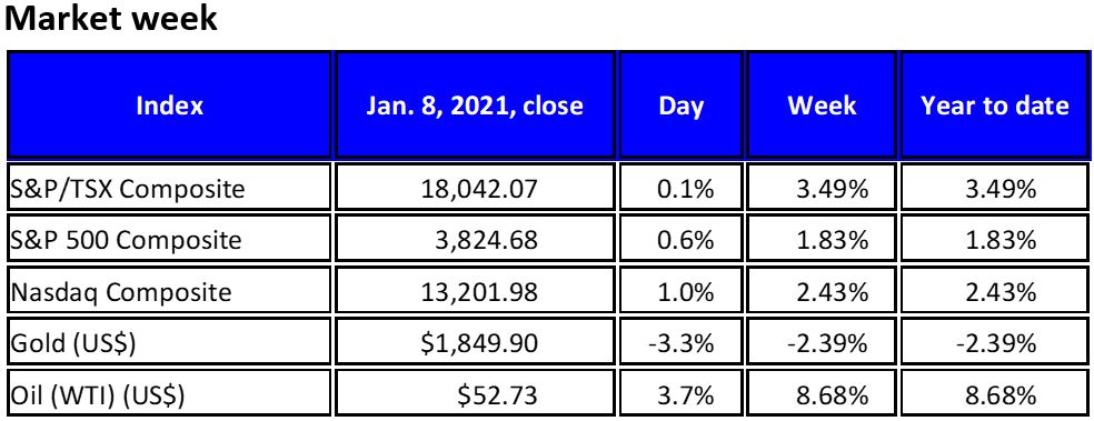 Canada’s stock benchmark, the S&P/TSX Composite Index, rose 3.5% in the first week of the New Year, building on a rather shallow 2.2% increase for the year in 2020. An 8.7% advance in the price of crude oil helped support Canada’s energy sector, as the S&P/TSX Capped Energy Index gained 10.2% on the week. In addition, more weakness in the U.S. dollar helped Canadian index performance. Gold, typically seen as a crisis hedge, wasn’t a factor as it retreated 2.4% on the week.
