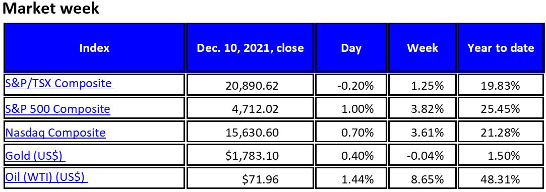 North American stock markets posted strong gains on the week, with the S&P 500 Composite Index closing at a fresh record high, advancing 3.8% on the week, as investors bought heavily into information technology, energy, consumer staples and materials. The Nasdaq Composite Index rose 3.6% on the week, propelled by strong gains in information technology. The gains came against a backdrop of another hike in the U.S. consumer price index, to an annual 6.8% in November, the highest rate in 39 years. Investors seemed unfazed by this, however, as the increase had been widely anticipated, and did not crack the 7.0% threshold that some analysts had forecast.