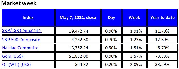 The S&P 500 Composite Index closed at a fresh record high on Friday, advancing 1.2% on the week. The Nasdaq Composite Index lagged, retreating 1.5% on the week, as investors continued to rotate out of growth stocks (with tech issues taking the brunt) and into value-oriented sectors seen as benefitting from economic recovery, such as industrials, materials, energy, financials, and transportation. Toronto’s S&P/TSX Composite Index also benefitted from this trend, gaining nearly 2% on the week, TSX heavyweight energy and financial sectors posted strong advances on the week. Crude oil gained 2.1% on the week, while gold jumped 3.6%.