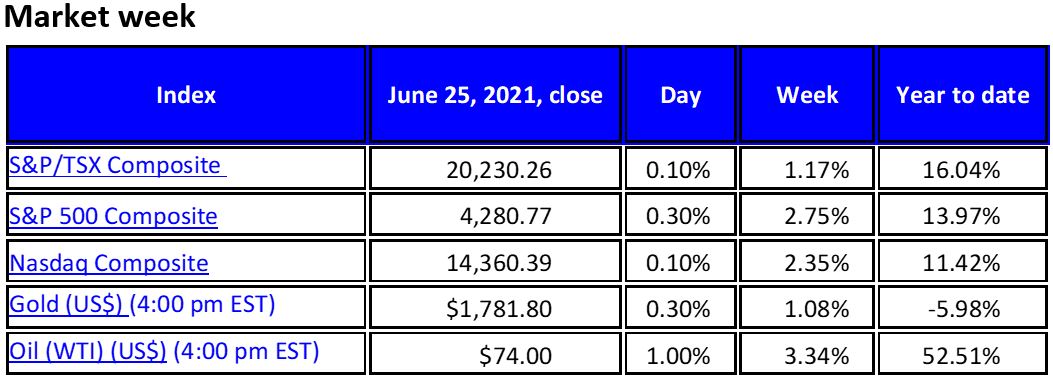 Against a backdrop of another uptick in U.S. inflation indicators, a bipartisan US$1.2 trillion infrastructure deal in Congress, and a hawkish tone from the U.S. Federal Reserve Board, North American stock indexes maintained their upward momentum touching record highs again during and posting some of their best weekly gains since February. The Fed’s Personal Consumption Expenditures Price Index registered an annual rate of 3.9% over the past 12 months, well above its 2% target, while the core rate came in at 3.4%, but with less than expected month-over-month increases as consumer spending remained flat in May. That suggested an easing of price pressures, lending support to the Fed’s theme that current inflation spikes are transitory, easing concerns of an earlier-than-anticipated tightening of monetary policy.