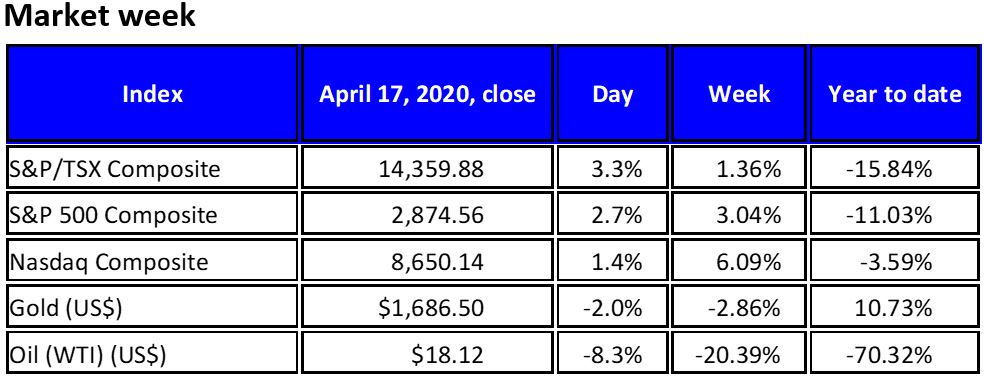 Looking for any kind of market recovery, investors piled into U.S. stocks, boosting the blue-chip S&P 500 Composite Index to a 3.0% gain on the week, while the Nasdaq Composite Index doubled that with a 6.1% rally. Toronto’s S&P/TSX Composite lagged, with a 1.4% gain, held back by a 20.0% weekly loss in the price of a barrel of crude oil, the shutdown of virtually all of Canada’s energy sector, and a 2.9% drop in the price of an ounce of gold.