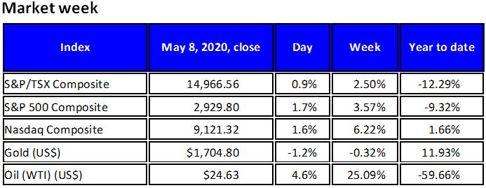 Skyrocketing unemployment numbers for April were already baked into the markets, so Friday’s advances in the big market indices were not unexpected. Statistics Canada reported that the Canadian unemployment rate rose to 13.0% in April as 2 million more jobs were lost in the month on account of the government-mandated lockdowns to combat the spread of new coronavirus. This followed a loss of 1 million jobs in March. Similarly, the U.S. saw a loss of 20.5 million jobs in April (some 18 million of which are classified as “temporary”), pushing the unemployment rate to 14.7% for the month, according to the Bureau of Labor Statistics.