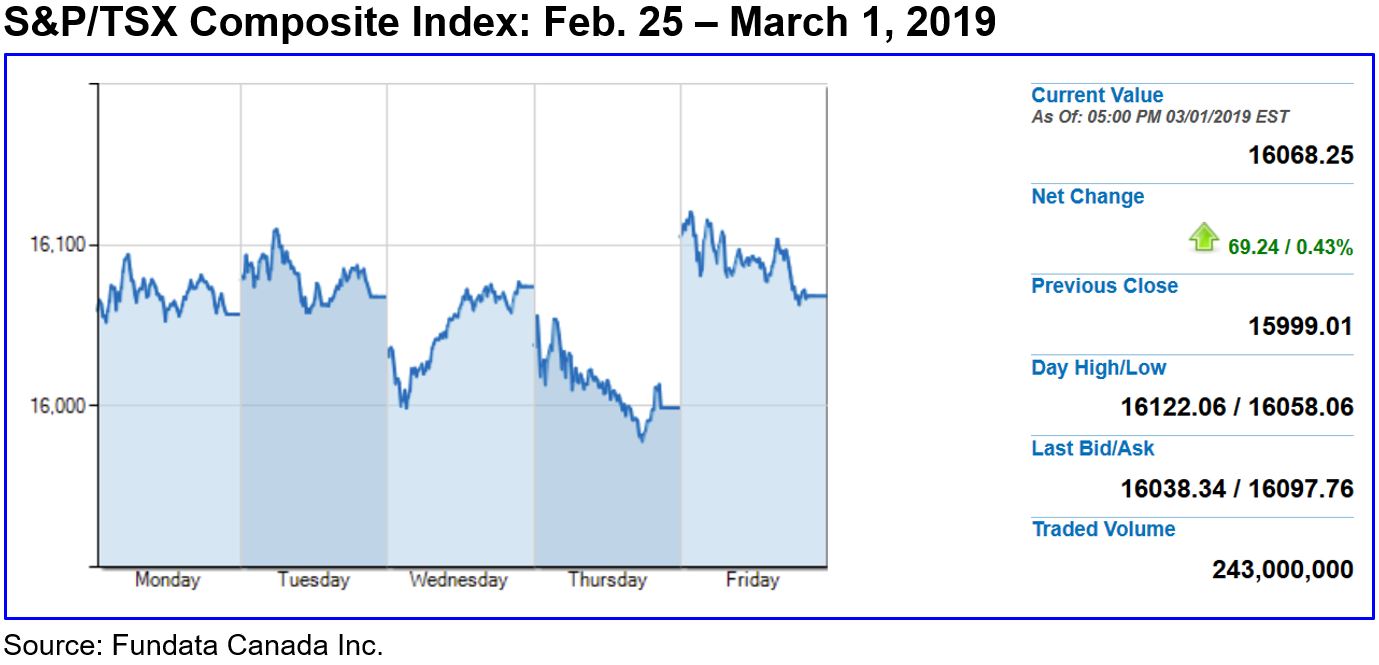 Reacting to strong U.S. GDP readings and the potential for a U.S.-China trade deal, the U.S. blue-chip S&P 500 Composite Index closed on Friday above the 2,800 mark for the first time since Nov. 8, advancing 0.4% for the week, while posting a 3.0% gain for February. The S&P 500 is now up 11.8% year to date, and is near to recovering losses sustained during the year-end stock market correction. Likewise, the technology-weighted Nasdaq Composite Index is ahead nearly 1% on the week, having closed February with a 3.4% monthly gain and advancing 14.5% year to date by Friday’s close. Toronto’s benchmark S&P/TSX Composite Index logged a 0.3% gain for the week, and was up nearly 3% in February, with a 12.2% year-to-date advance as of Friday’s close. Crude oil dropped 2.5% on the week, but is still ahead 22.8% year to date.