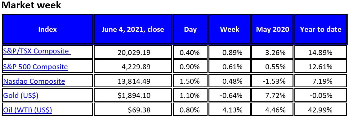 Stocks ended higher on the week, as a positive U.S. jobs report signalled continuing momentum in economic growth, but not at a rate that analysts believe would trigger the U.S. Federal Reserve to begin removing monetary stimulus ahead of their mid-2022 target date. U.S. non-farm employment rose 559,000 jobs in May, less than economists had predicted, but roughly twice the gain posted in April. The U.S. unemployment rate notched down to 5.8% in May from 6.1% in April, while the labor force participation rate remained largely unchanged at 61.6%, owing to continuing enhanced government unemployment benefits, which have the consequence of suppressing employment growth.