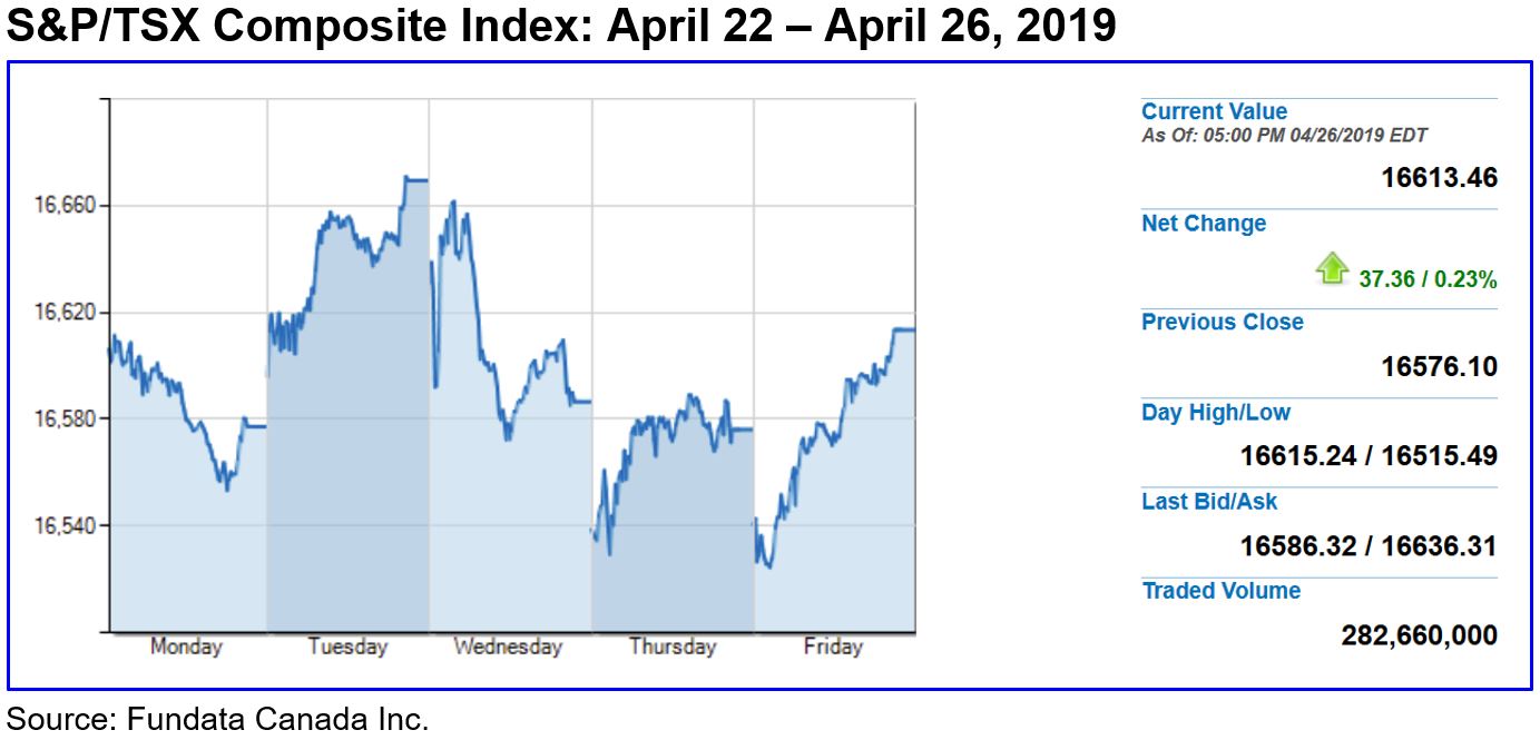 A higher-than-expected reading on U.S. economic growth in the first quarter helped buoy U.S. stock indices to solid weekly gains, with both the blue-chip S&P 500 Composite Index and the Nasdaq Composite Index registering record-setting highs at Friday’s close. This despite softer earnings reports from Dow components Intel Inc. (NASDAQ: INTC) and Exxon Mobil Corp. (NYSE: XOM). The S&P 500 gained 1.2% on the week, while the Nasdaq gained 1.9% and is ahead 23% year to date. Against a backdrop of softening crude oil prices, which dropped 1.9% on the week, Toronto’s S&P/TSX Composite Index broke even week-over-week, as the Bank of Canada gave a downbeat forecast on its economic outlook, kept its target overnight rate on hold at 1.75%, and announced that it is abandoning its rate-hike bias.
