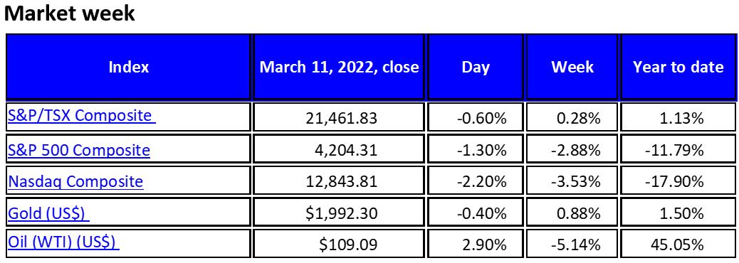 Energy prices remained elevated, though backing off somewhat from previous highs. Crude oil closed Friday at US$109.90 per barrel, down 5.1% on the week, keeping the energy sector on the plus side in both Canada and the U.S. It was not enough to prop up the S&P 500 Composite Index, which lost another 1.3% on the week, led by a 5.8% weekly loss in the Consumer Staples sector, and is now in a correction phase, down over 10% from its recent high. Similarly, the Nasdaq Composite Index fell 3.5% on the week as the Information Technology sector logged a 3.8% loss on the week, and is approaching bear market territory with a year-to-date loss of 18%.