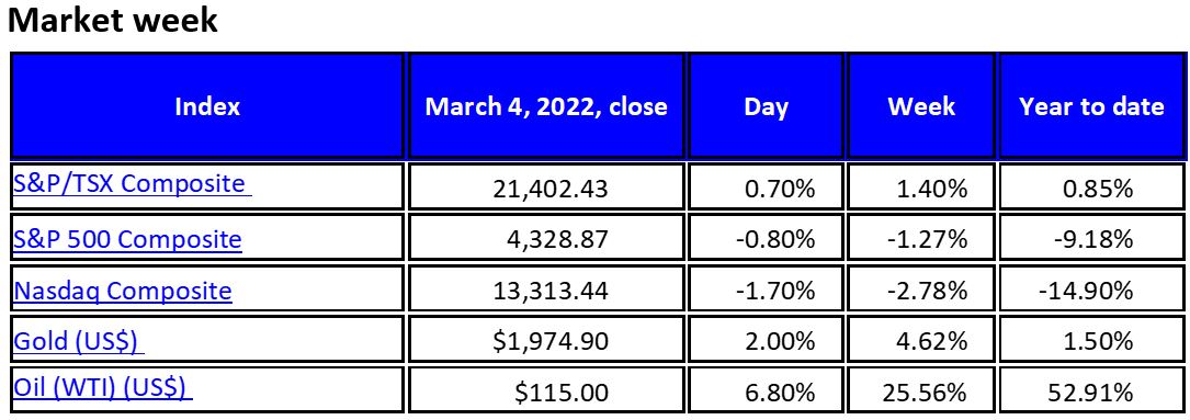 The major U.S. stock indexes lost ground again this week, as high inflation (7.5% annual rate in January) and a promise by the U.S. Federal Reserve Chair Jay Powell that rate hikes are coming kept selling pressure on equities, aided and abetted by the macro uncertainties arising from the continuing Russian invasion of Ukraine. While energy and utility stocks gained ground with various sanctions and embargoes stanching much of Russian energy exports, it wasn’t enough to offset steep delcines in U.S. bank and financial sectors. Even the gain of 678,000 jobs in February did not help market sentiment. The S&P 500 Composite Index lost 1.3% on the week, as a result, and the technology-weighted Nasdaq Composite Index retreated 2.8%.