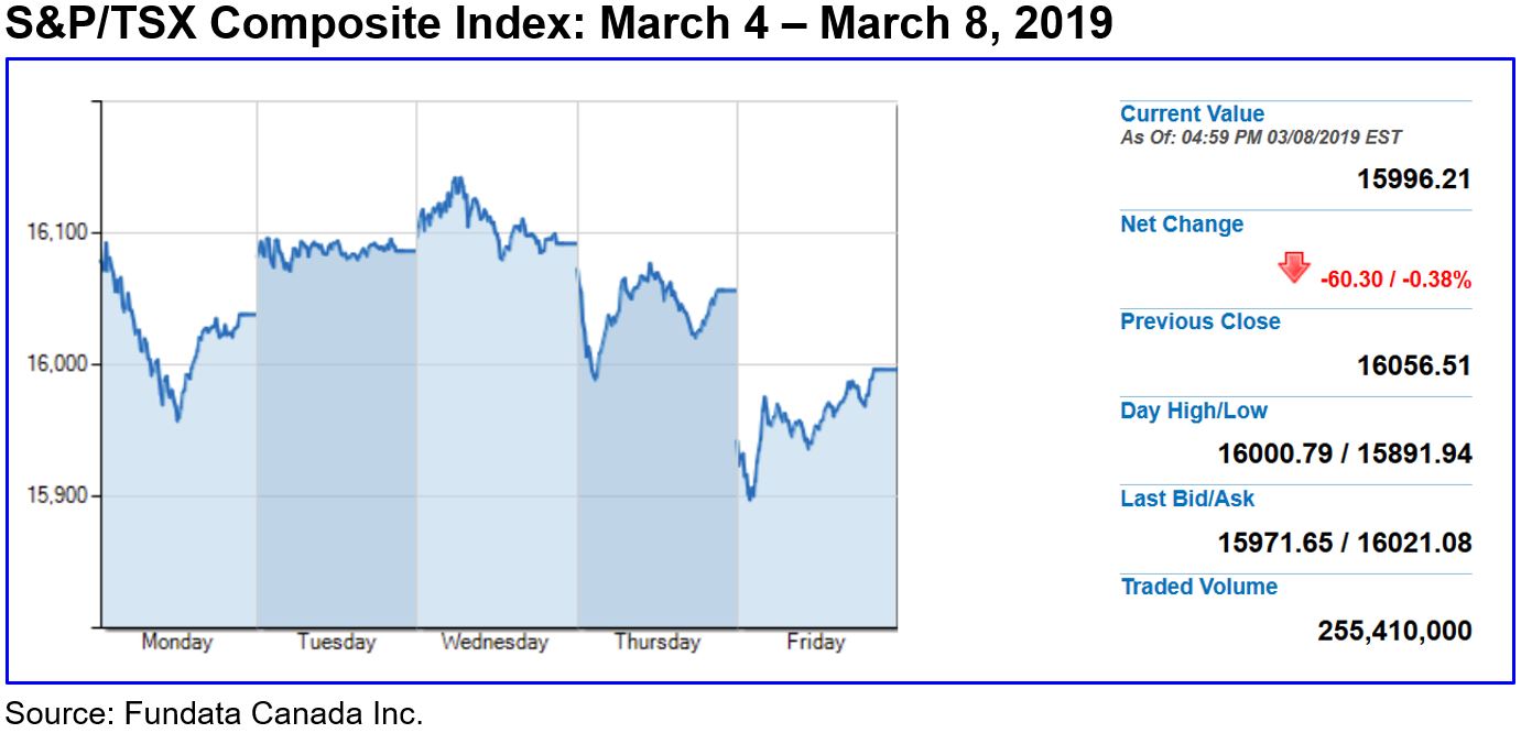 The week ended on a downbeat for major North American stock indices. The main market gauges all lost money, as investors were rattled by a low monthly U.S. job-creation report for February. In addition, Chinese export reportedly fell by 20% in February, while the European Central Bank took a decidedly more dovish tone on monetary policy, now extending its low rate regime until 2020 from an earlier plan to commence rate hikes this year. The S&P 500 Composite Index slumped 2.2% on the week, while the Nasdaq Composite Index retreated 2.5%. Toronto’s S&P/TSX Composite Index fared better, edging down just below breakeven on the week, as a positive jobs report and a slight weekly increase in the price of crude oil helped buoy investor sentiment for Canadian issues.