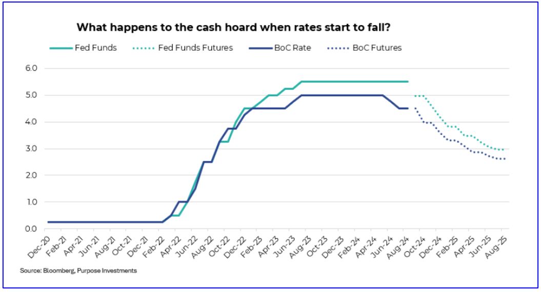Both the Fed and The Bank of Canada have started cutting rates. Of course, the future path of rates remains uncertain, but the trajectory is not…it’s down. Inflation has cooled, as has economic activity, so rate cuts are a near certainty. The speed and magnitude are unknown based on the data and expectations at this time. And that means those juicy cash yields will start to come down.