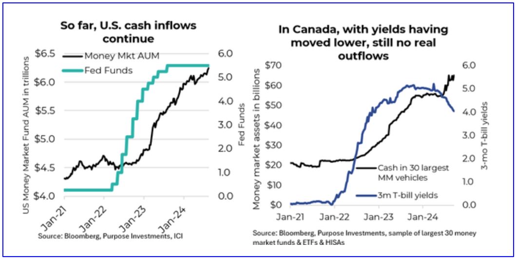 In the U.S., money market balances increased to over $6 trillion over the past year and a half from $4.5 trillion. Similar trends were also evident in Canada, adjusted for proportionate population/wealth. This leads to the big question: What will this money do as yields are now coming down? This is a multi-trillion-dollar question.