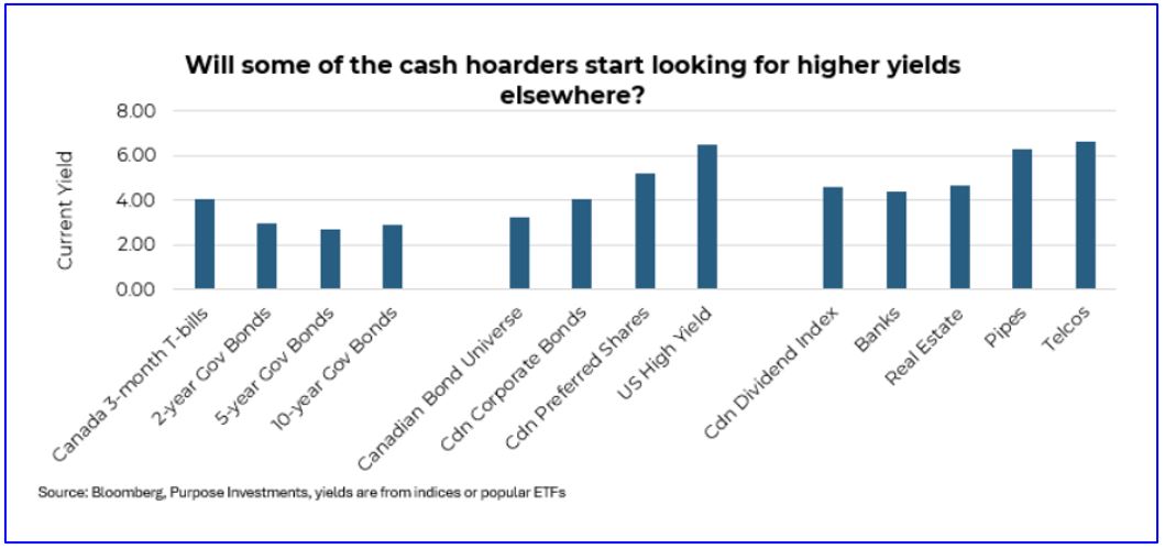 Okay, we all watched this play out over the past few years. As cash yields rose, the money started flowing. And did it ever! Billions and trillions flowed into various cash vehicles from GICs, HISAs, and money market funds. A special thanks must be given to “inflation,” which returned in a big way, resulting in the central bank responses of aggressively hiking overnight rates. The result: Cash yields quickly became rather alluring.