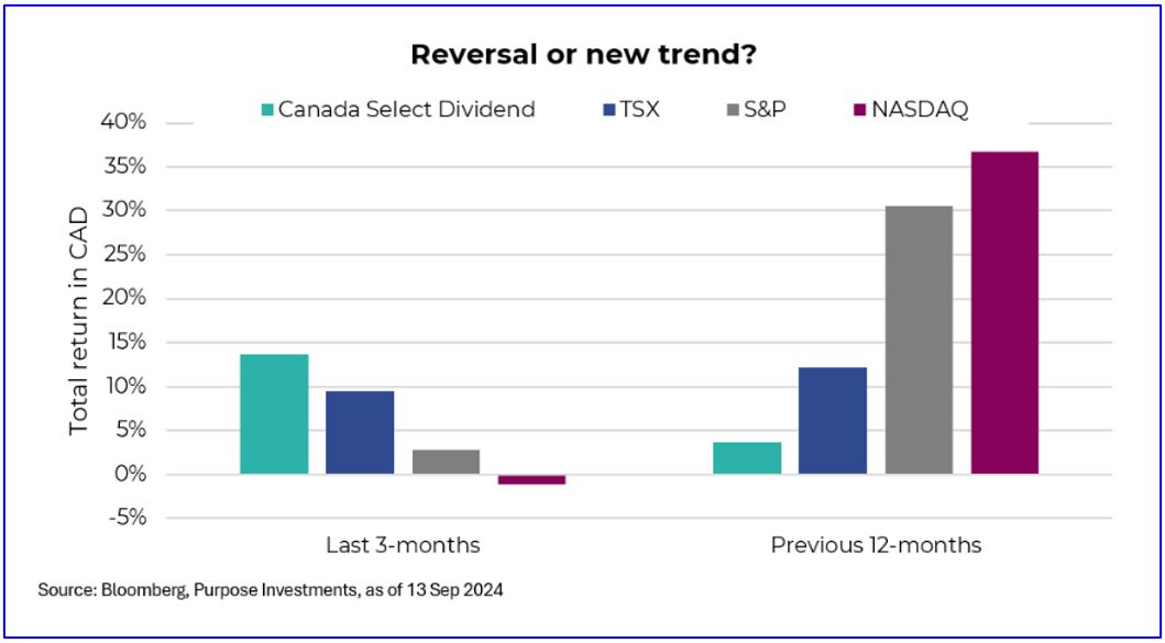 Telcos and pipelines yielding 6%-7% might not be compelling enough compared with cash at 4.5%. But what about if cash yielded 4% or 3%? It is worth pointing out that over the past three months, the DJ Canadian Dividend Select index has returned 13.5% compared with 9.6% for the broader TSX, 2.9% for the S&P, and -1% for the Nasdaq – a clear reversal of the previous year.