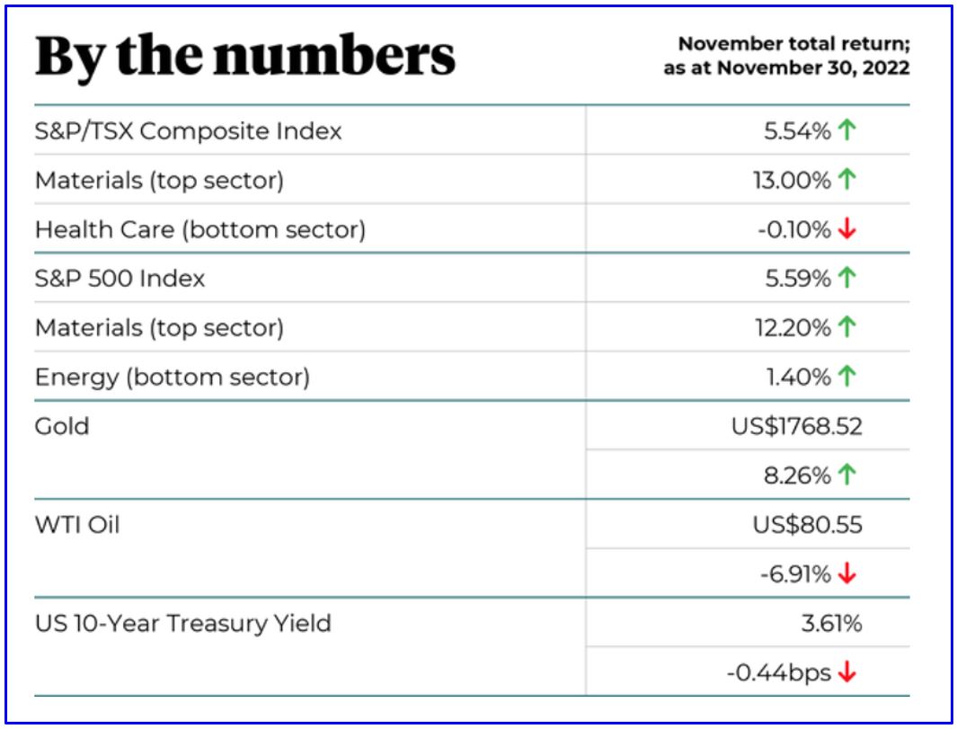 The end result of November was an impressive bounce higher. The S&P 500 was higher by 5.4%, the Nasdaq by 4.4%, and the TSX, which has been the leader, is now only off 3.5% on the year after gaining 5.3% on the month.