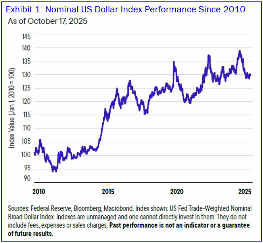 We’ve been presenting our 2026 economic and market outlook starting with three cyclical themes that we believe are important to understand. We looked first at the theme of broadening, that is, our conviction that investment opportunities across regions and asset classes are expanding. And last time, we examined the second of our cyclical themes – steepening of the yield curve, which we believe reinforces our previous broadening thesis, as investors will be incentivized to seek new opportunities in duration, credit, equities and elsewhere. In this post, we’ll drill down into the third of our major cyclical themes – the weakening of the U.S. dollar.