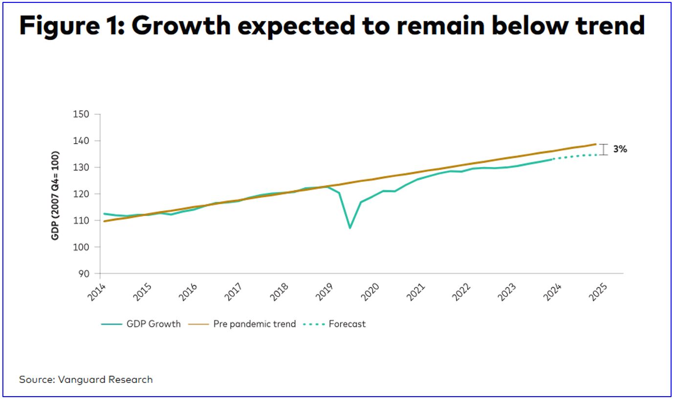 We expect gross domestic product (GDP) growth to be 1.3% for 2025, based on our previously mentioned tariff assumptions. We believe that the “uncertainty tax” is impairing the Canadian labour market and business investment and will result in 0.25% lower growth for the year. Additionally, tariffs and retaliation coupled with softer U.S. growth will lower growth by another 0.25%. Lower exports by Canada will result in weaker terms of trade and reduce potential GDP as excess supply is created in the short run.