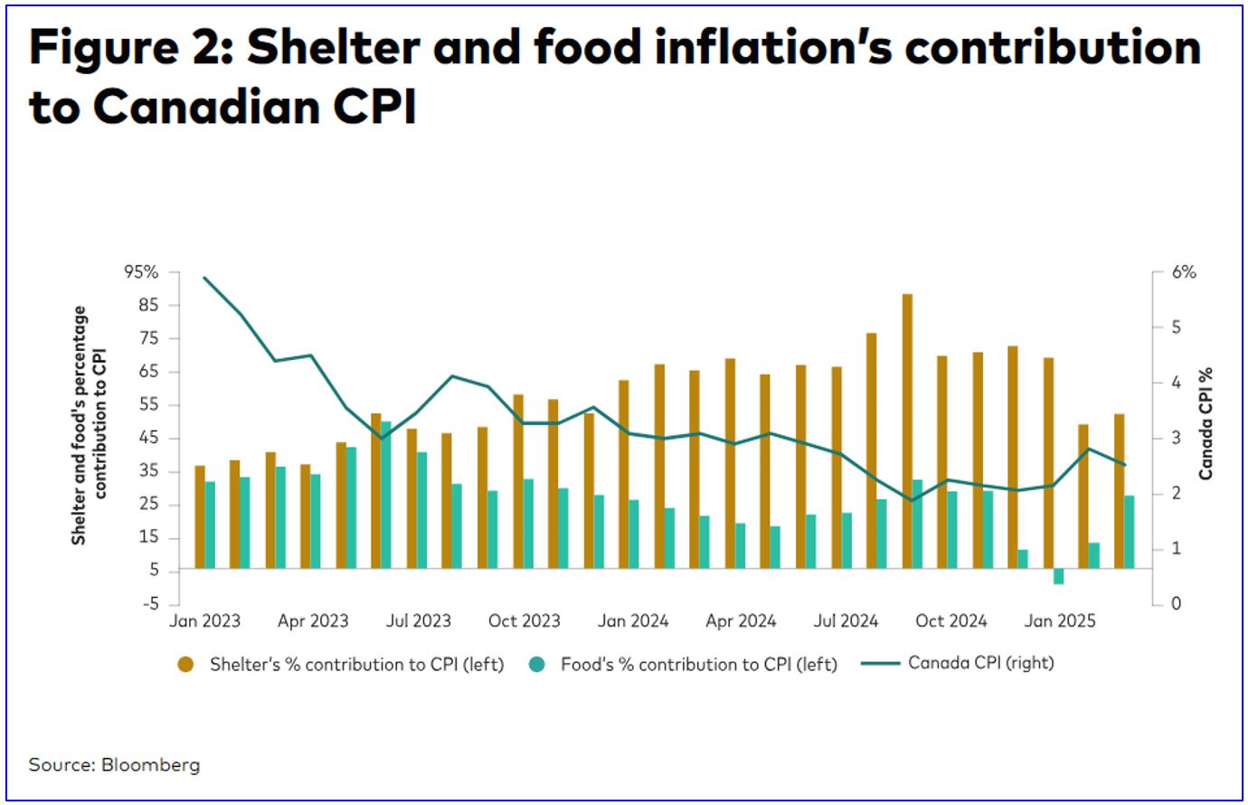 In Figure 2, we see the components of Canadian headline inflation and their weighted contribution. We see that shelter price’s contribution to CPI has declined since September 2024 and food inflation had a small negative contribution to CPI once the GST/HST tax holiday began on December 14, 2024.